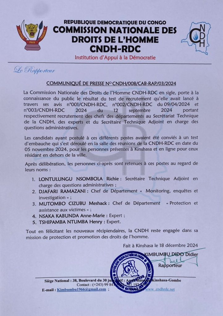 La Commission nationale des droits de l’homme de la République démocratique du Congo (CNDH) annonce la nomination de M. Richie Lontulungu Nsombola au poste de Secrétaire Technique adjoint.