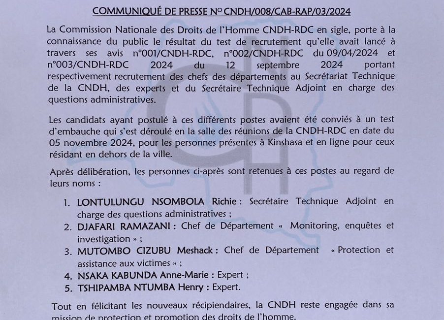 La Commission nationale des droits de l’homme de la République démocratique du Congo (CNDH) annonce la nomination de M. Richie Lontulungu Nsombola au poste de Secrétaire Technique adjoint.
