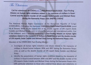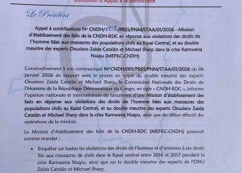 Appel à contributions No CNDH/003/PRES/PNM/STAA/01/2026 – Mission d’établissement des faits de la... Read More Appel à contributions No CNDH/ 003/PRES/PNM/STAA/01/2026 – Missiond’établissement des faits de la CNDH-RDC en réponse aux violations des droits de l’homme liées aux massacres des populations civils au Kasai Central, et au doublemeurtre des experts Onusiens Zaida Catalán et Michael Sharp dans la crise KamwenaNsapu (MEFKC-CNDH)